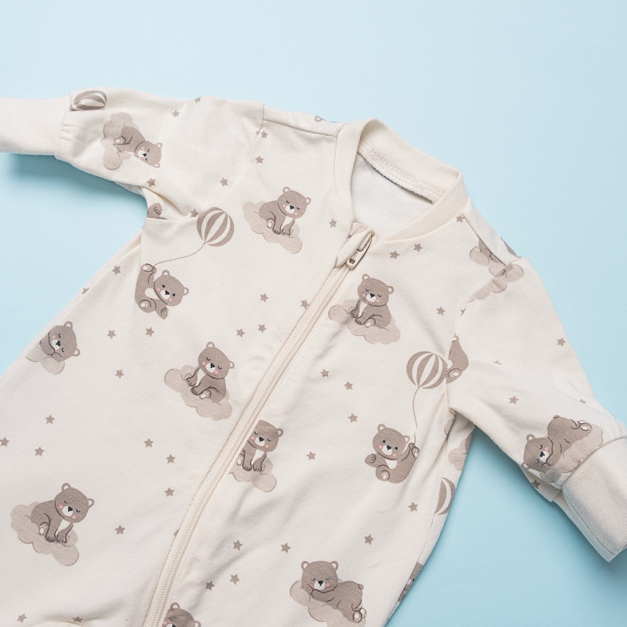 Wrap your baby in cozy dreams with this Dreamy Bear Romper from Happy Year. Designed with soft neutral tones and a whimsical print featuring sleepy bears, balloons, and twinkling stars – it’s perfect for bedtime snuggles and all-day cuddles.