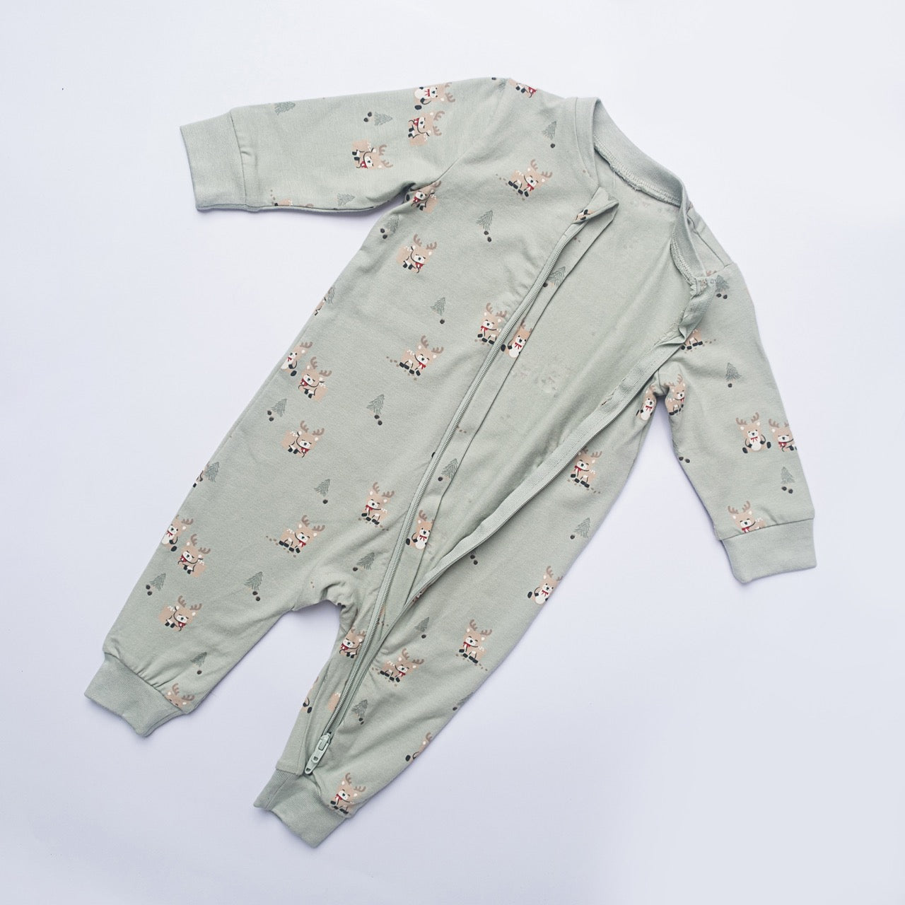 Wrap your baby in festive charm and cozy comfort with our Sage Green Reindeer Zip-Up Baby Romper. The soft sage green base is delightfully adorned with cute reindeer and pine tree prints—perfect for the holiday season or any winter day filled with cuddles and play. Made from a soft, breathable cotton blend, this romper is designed to keep your little one snug and happy all day long. The front zip closure allows for hassle-free dressing and diaper changes, while the ribbed cuffs on the sleeves and ankles ensure a secure, comfortable fit.