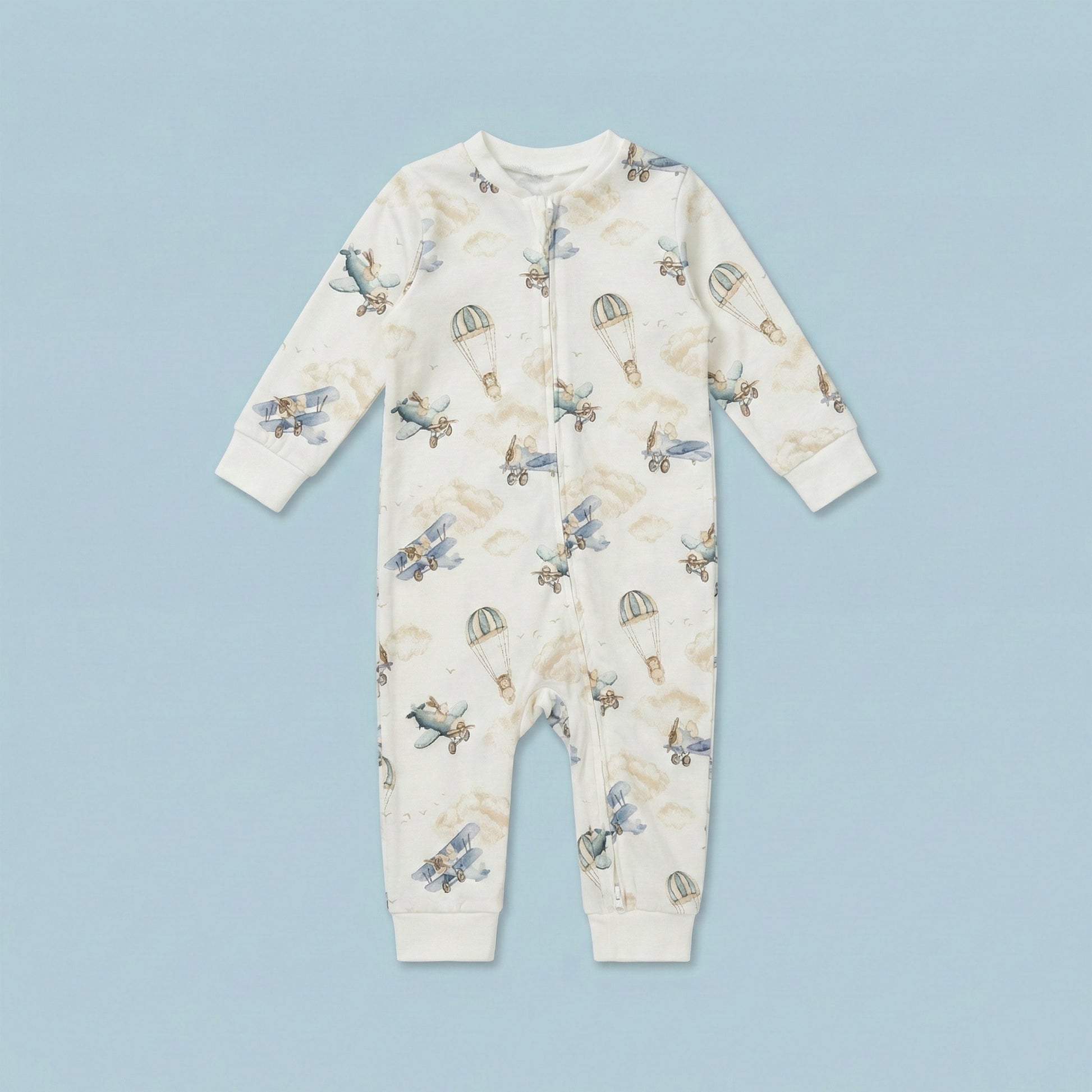 The easy front zipper ensures quick, stress-free diaper changes, while the full-length design with soft ribbed cuffs provides a snug yet flexible fit. Featuring a charming vintage airplane and hot air balloon print set against a soft cream backdrop with dreamy clouds, this romper brings a timeless, adventure-inspired touch to your baby’s wardrobe.